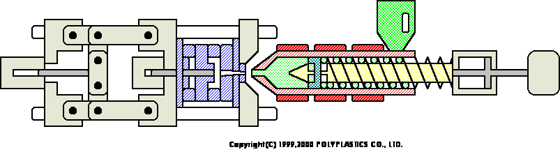 合模裝置是開閉模具以執行脫模作業,而且也有如圖所示的肘桿方式,以及利用油壓缸直接開閉模具的直壓方式。注射裝置是將樹脂予以加熱融化後再射入模具內此時,要旋轉螺桿,并如圖所示讓投入到料斗的樹脂停留在螺桿前端,經過相當于所需樹脂量的行程儲藏後再進行射出。當樹脂在模具內流動時,則控制螺桿的移動速度并在填充樹脂後用壓力(保壓力)進行控制。當達到一定的螺桿位置或一定射出壓力時則從速度控制切換成壓力控制。