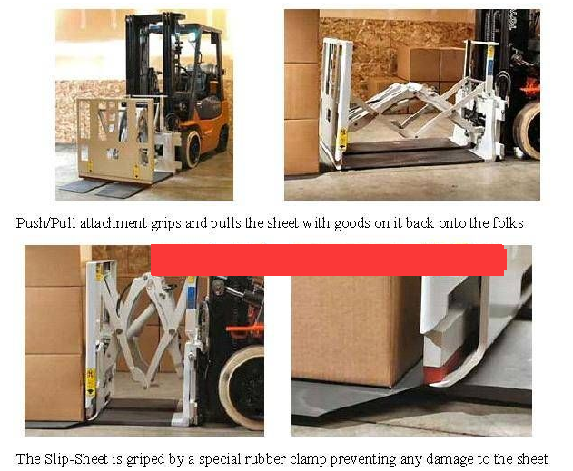 首先叉車是要經(jīng)過改裝的插齒變成一塊整體光滑的平板并且一般要求材質(zhì)304不銹鋼,然后就是要加裝一個液壓推擠裝置。推擠裝置有一個類似卡子的東西可以卡住滑托盤。